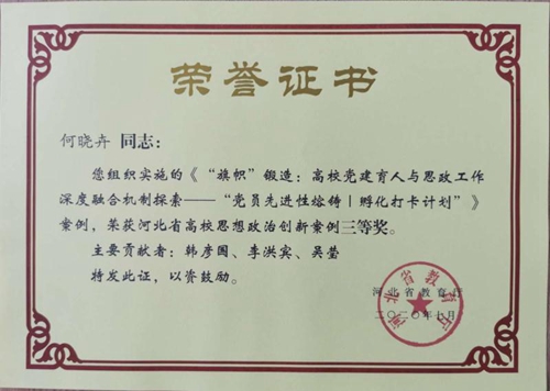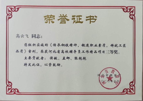 我院报送的《筑培思政基石 赓续红色基因—构建多层次立体式思政工作平台》案例荣获河北省高校校园文化建设优秀成果三等奖;《旗帜锻造:高校党建育人与思政工作深度融合机制探索——“党员先进性熔铸 孵化打卡计划”》案例荣获河北省高校思想政治创新案例三等奖;《大学生能力提升工程——“淬火计划”》案例荣获河北省高校辅导员工作精品项目二等奖;《传承钢铁精神,锻造职业素质,铸就工匠品质》案例荣获河北省高校辅导员工作精品项目三等奖。