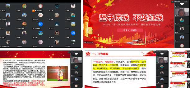 第七届党风廉政宣传月共开展“专题学习、讲好廉政党课、征集廉洁警句、观看警示专题片、二十大知识问答竞赛”五项活动。活动期间,各党总支、直属党支部统筹安排、精心组织,采取线上线下相结合的方式组织全体党员和教职工认真学习了《党的二十大报告》《十九届中央纪委工作报告》以及《党章(修正案)》,观看了警示专题片《国家监察》。各党总支、直属党支部书记带头讲好廉政党课,结合近年来教育系统发生的腐败案例,教育引导党员干部和教职工提高廉洁自律意识。学校纪委在二十大知识问答竞赛活动中,组织全校党员干部开展了线上答题,掀起了全校党员学习二十大的热潮;在征集廉洁警句活动中,围绕“廉洁从政、廉洁从教、廉洁从学”在全校范围内征集廉洁警句186条,最终精选出35条在纪检监察处官网进行展播。