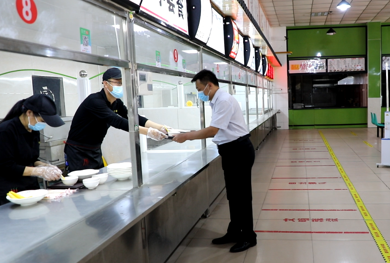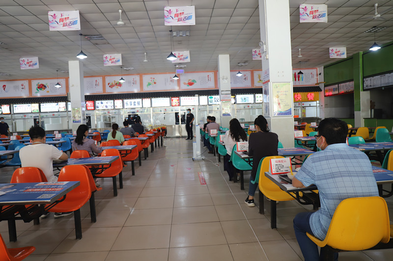 食堂就餐环节。学生佩戴口罩间隔1米,有序等待。进入食堂前进行体温测量。取餐后,按隔板标识按照一桌一人,单向落座就餐。