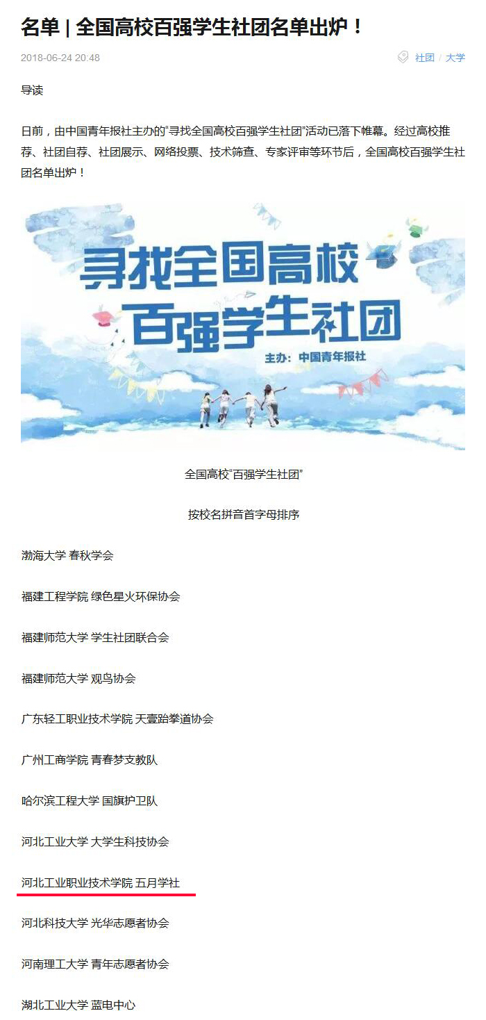 日前,由中国青年报社主办的“寻找全国高校百强学生社团”名单落定。经过前期高校推荐、社团自荐、社团展示、网络投票、技术筛查、专家评审等环节,我院五月学社凭借综合实力成功跻身全国高校学生社团百强行列。据悉,河北高校共有7个学生社团入选,我院五月学社是省内唯一一所高职院校中入选的百强学生社团。