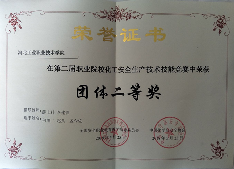 5月22日-24日,由全国安全职业教育教学指导委员会、中国化学品安全协会主办的全国职业院校化工安全生产技术技能竞赛在秦皇岛博赫科技开发有限公司开赛。来自全国20个省、直辖市、自治区的45支队伍参加了比赛。我院派出由环境与化学工程系薛士科、李建锁老师指导的学生代表队,经过激烈角逐最终荣获大赛团体二等奖。