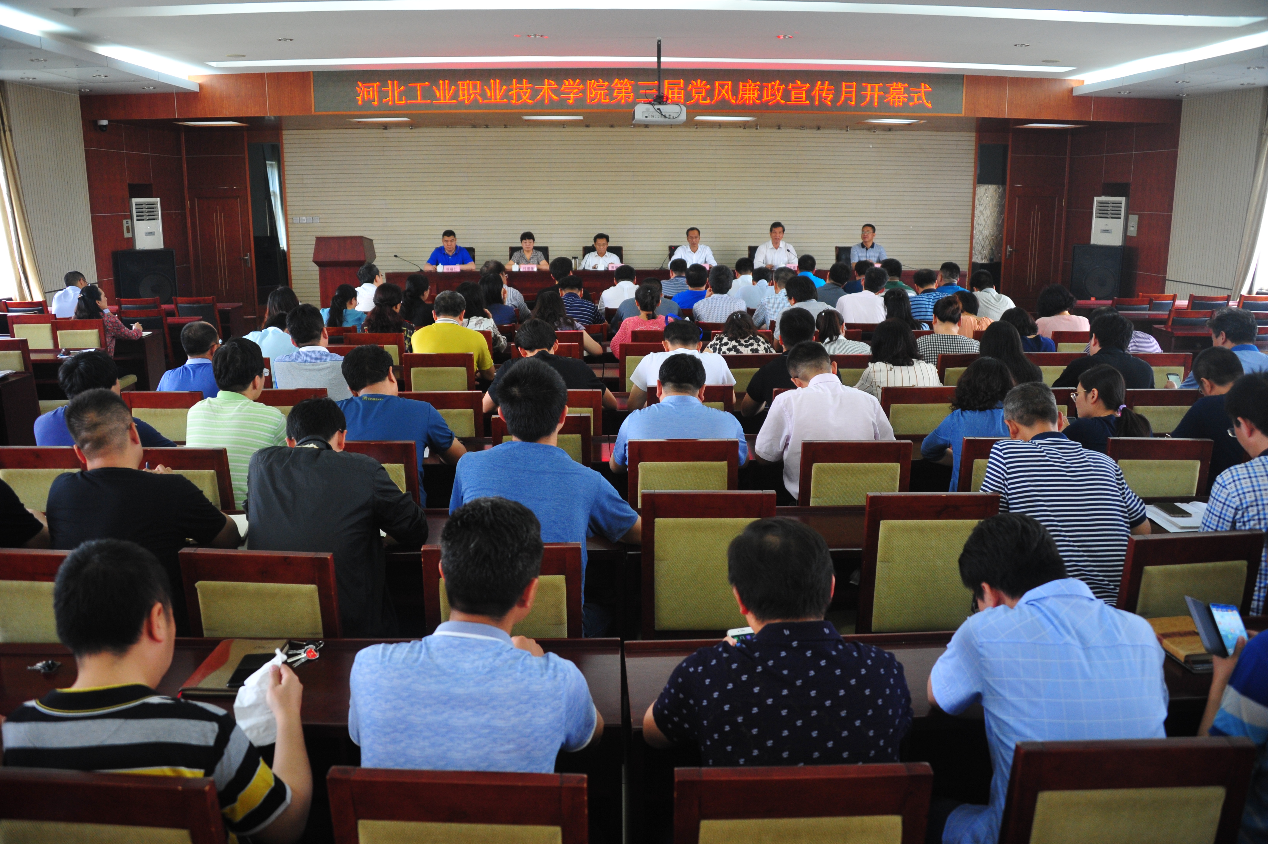 5月15日下午,学院第三届党风廉政宣传月开幕式在办公楼五楼报告厅举行。学院党委书记王振杰、院长贾俊礼以及领导班子全体成员出席会议,全院科级以上党员干部参加会议,会议由党委副书记王建刚主持。