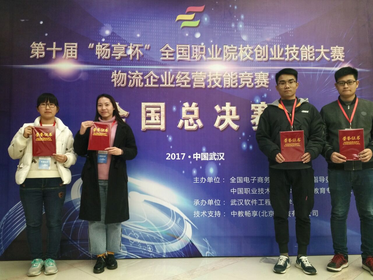 12月1-3日,第十届全国职业院校创业技能大赛——物流企业经营技能竞赛全国总决赛在武汉软件工程职业学院举行。我院派出由杨志伟、王彦飞老师及2016级物流管理专业4名学生组成的参赛队,与来自全国85所高校的97支代表队展开角逐。最终,我院参赛学生代表队荣获二等奖。