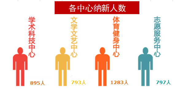 新生对学术型和体育类社团更感兴趣,在社团的四个中心中,体育健身中心的报名人数最多,有1283人加入,占纳新总数的34%;其次是学术科技中心,占纳新总数的24%。