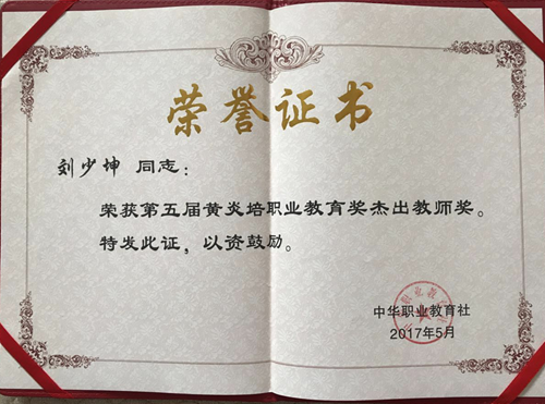 刘少坤老师喜获全国第五届黄炎培职业教育奖“杰出教师奖”,是我院师资队伍素质和风采的集中展示,也是我院师生探索职业教育改革模式取得的良好成绩,更是对全体教师的一次振奋人心的激励和鼓舞。全体河北工院人将继续秉承“明德、团结、自强”的校训精神,坚持“夯内涵,建品牌,上层次”的战略发展理念,发扬不断进取,开拓创新的时代精神,顽强拼搏,锐意进取,努力开创学院健康发展的新局面!
