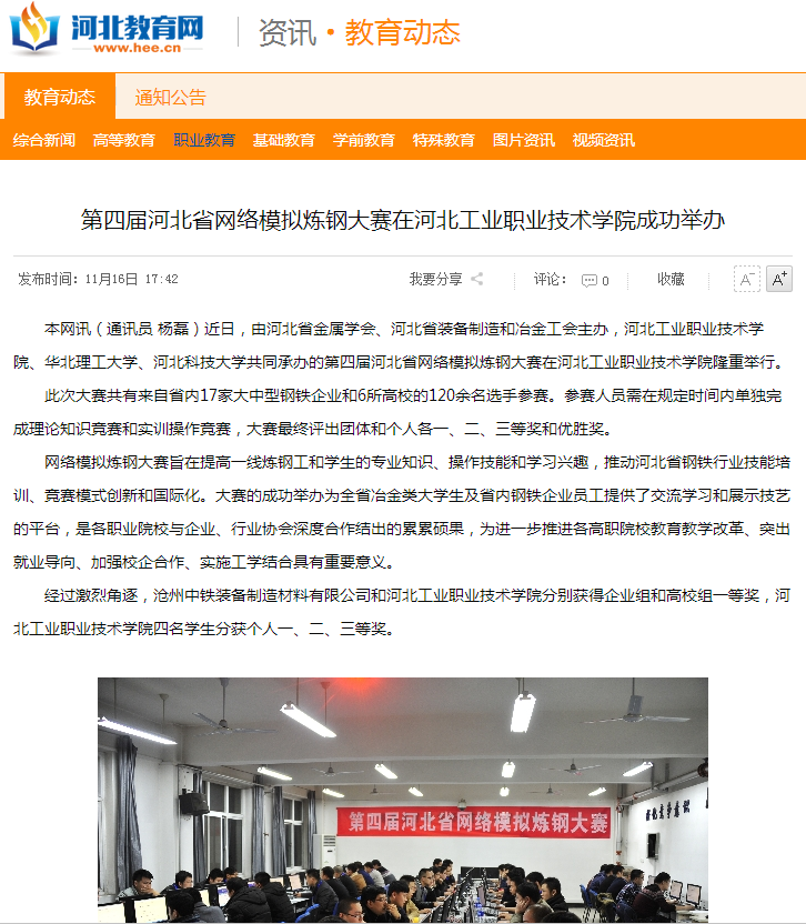 11月12日至13日,由河北省金属学会、河北省装备制造和冶金工会主办,我院、华北理工大学、河北科技大学共同承办的“河北省第四届网络模拟炼钢大赛”在我院隆重举行。河北省金属学会、河北新闻网、河北教育网等媒体对赛事进行了报道。