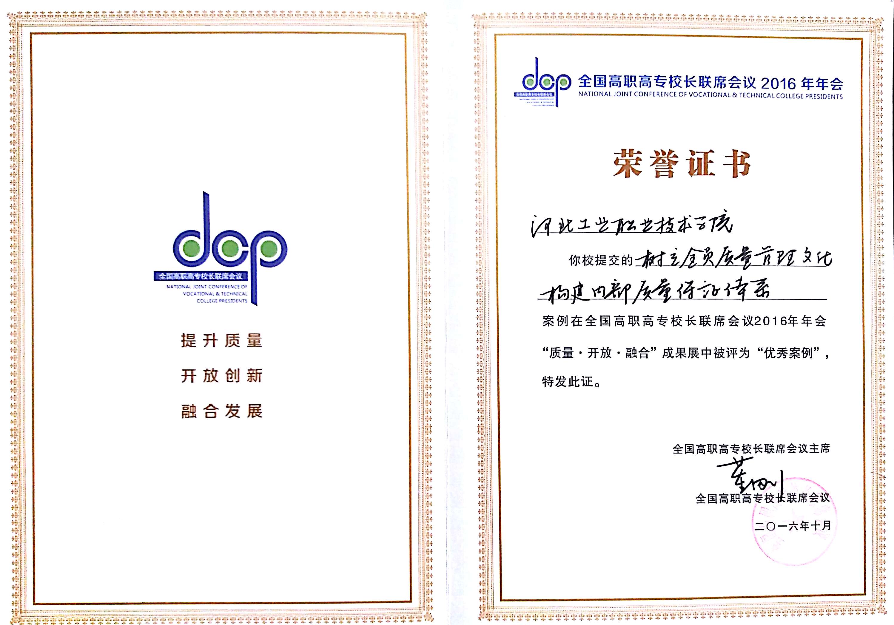 在刚刚结束的全国高职高专校长联席会议2016年年会上,我院“树立全员质量管理文化 构建内部质量保证体系”典型案例被评为优秀案例。获此殊荣,既是对我院内部质量保证体系建设工作的充分肯定,也是下一步推进我院内涵建设的动力。