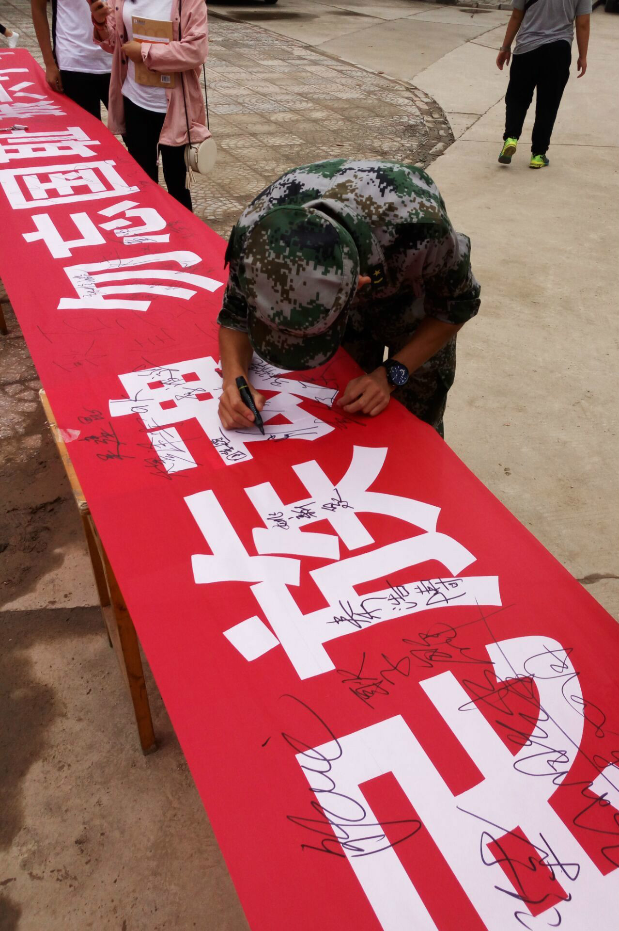 活动现场,我院同学将印有“纪念九一八,弘扬民族魂;勿忘国耻,振兴中华”的横幅在1号楼前展开,随即便引来许多师生的驻足签名。正在接受军训的2016级新同学热情高涨,纷纷在横幅上庄严地签下自己的名字,表达自己的爱国之情、报国之志。一名新生说到“虽然黑暗历史离我们远去,但是历史我们要永远铭记!我们绝不允许历史悲剧重演!”另一位签过名的新生说到“签名活动让我再次想起了中华民族那段屈辱的历史,自己无论在军训中遇到困难还是在以后的大学生活中遇到挫折,都不会退缩。‘落后就要挨打’的教训将激励自己奋勇直前!”一名大二同学说到“今年是九一八事变爆发八十五周年,我们在这里签上自己的名字是一种纪念,更是一种承诺。铭记历史,振兴中华是我们的责任。”