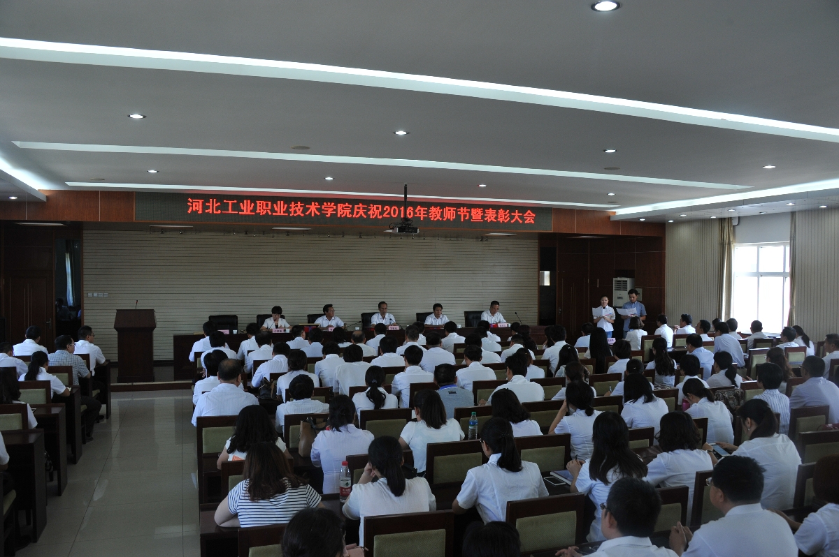 大会在庄严的国歌声中拉开序幕。贾俊礼院长宣读了获得2015年度河北工业职业技术学院先进党支部、优秀党务工作者、优秀共产党员、考核优秀集体与个人、优秀教师、优秀教育工作者名单,及2015-2016年度获得上级主管及相关部门表彰的先进集体和先进个人名单,并对先进集体、个人进行了表彰。学生代表夏佳豪、苏苏代表全院同学献词,向广大教师致以衷心的敬意和节日的祝福;工商管理系王文娟老师作为优秀教师代表发言,感谢学院为广大教师创造的良好工作学习和生活环境,表示将继续努力,爱岗敬业、严谨笃学,为学院进一步发展贡献力量。