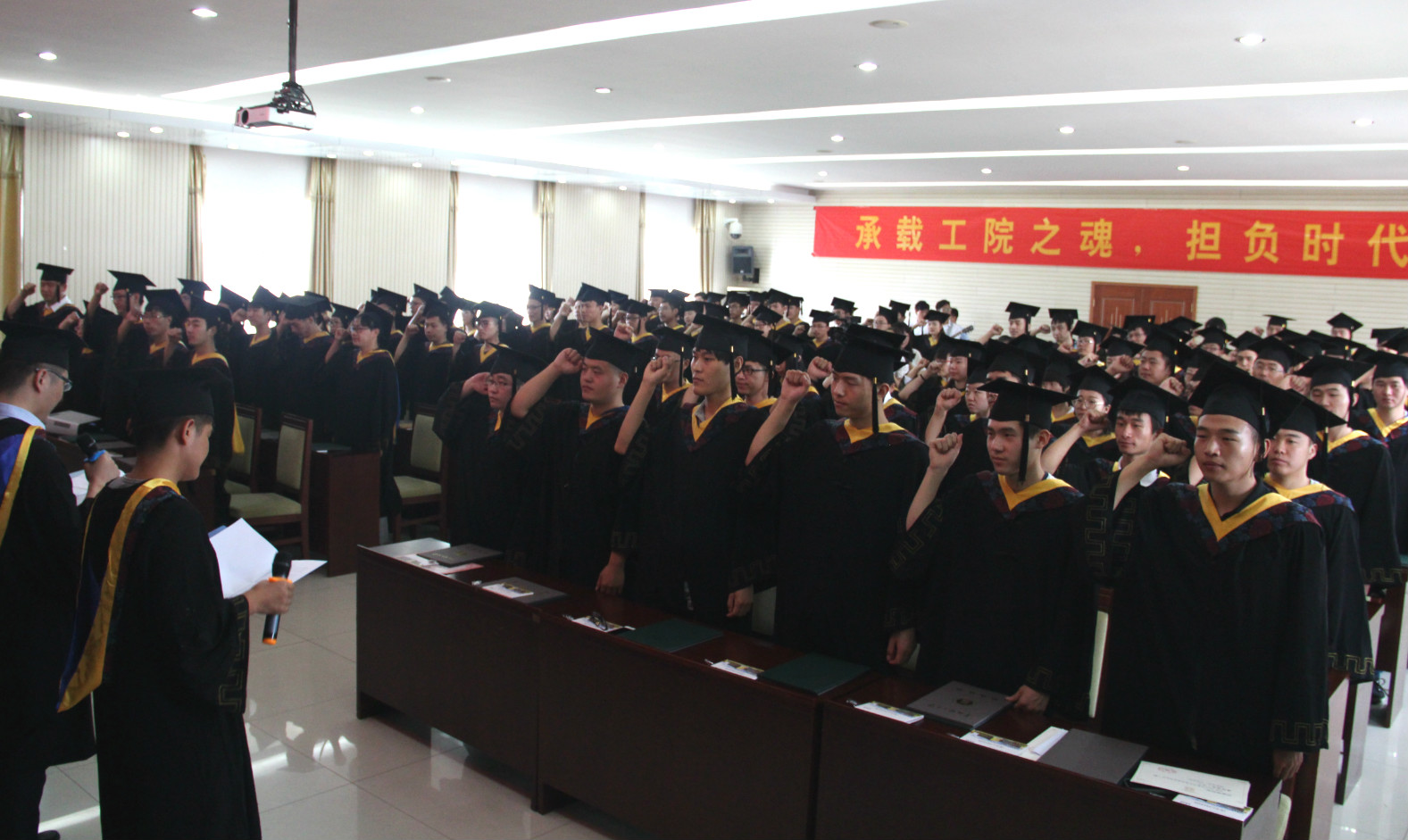 学士学位授予仪式后,毕业生代表发言并向母校献礼,在告别母校,走向社会之际庄严宣誓:我们成长于工院,我们成就于未来。承载工院之魂,担负时代之命,以己之能报国恩,付我之力兴中华。我们铭记明德、团结、自强的校训,用聪明和才智奉献社会,以品格和精神影响他人,今天我以母校为荣,明天母校以我为傲!