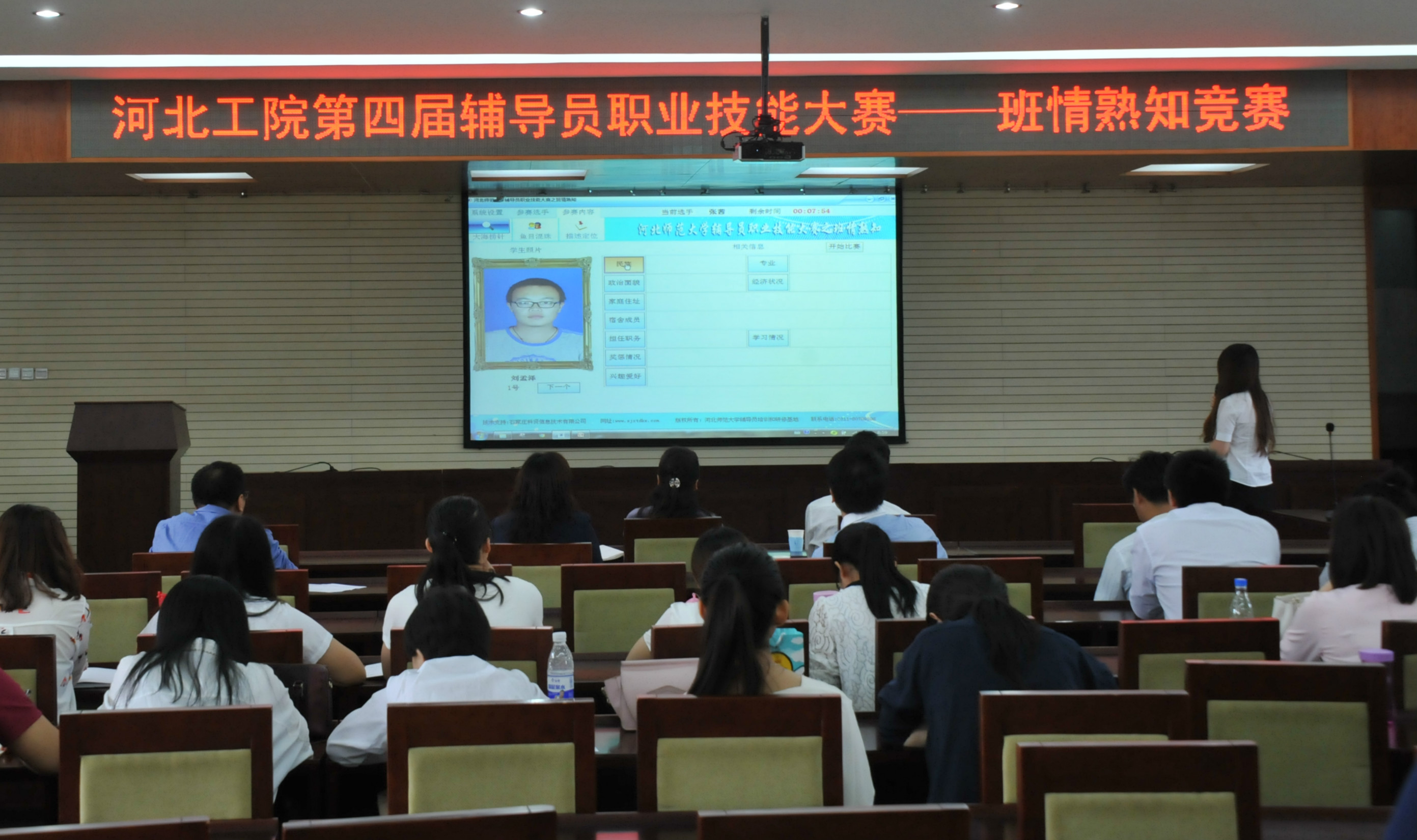 全院9系27名辅导员参加了本次比赛,比赛共分“大海捞针”、“鱼目混珠”、“描述定位”三个环节,主要考察参赛选手对班级每一名学生基本信息的掌握情况,包括姓名、专业班级、政治面貌、家庭住址、奖惩情况、学习情况、兴趣爱好等十项内容,多角度、多层面地考察辅导员在日常工作中对学生基本情况的了解与熟知程度。比赛中,参赛老师沉着冷静、谈吐从容,对学生信息准确而流利的回答,赢得了在场观众的阵阵掌声。