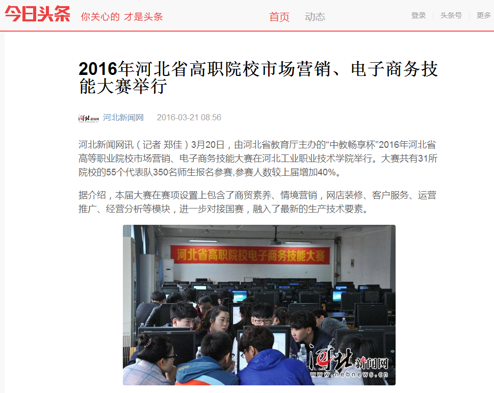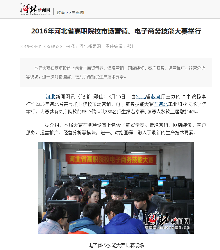 3月20日,由河北省教育厅主办的“中教畅享杯”第二届河北省高等职业院校市场营销、电子商务技能大赛在我院拉开帷幕。河北新闻网、燕赵都市报、河北教育网、今日头条对此项赛事进行了报道。