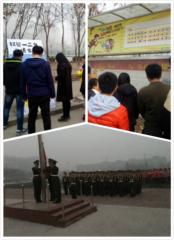 12月9日,院团委举办纪念“一二•九”学生爱国运动80周年升旗仪式,号召广大团员青年牢记历史使命,肩负时代责任,遵守校规校纪,规范个人言行,努力学好专业知识。“铭记一二•九,弘扬爱国情”海报图片展览,则全面展现了80年前青年学生为捍卫民族尊严和祖国统一抛头颅、洒热血的历史画面,点燃了广大青年学生的爱国热情。