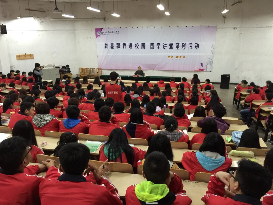 3119教室里座无虚席,河北省书画艺术研究院理事、河北省书法家协会会员周士甲老师正在为同学们讲授题为“前进之光——学国学的生活意义”国学讲座。周老师从“国学”入手谈及“时尚”; 以“国学”根源为出发,分享了先秦经典及诸子学为根基,涵盖两汉经学、魏晋玄学、宋明理学和同时期汉赋、六朝骈文、唐宋诗词、元曲与明清小说、历代史学等一套特有而完整的文化、学术体系在生活中的意义;用“国学”引导大家了解中国传统文化精髓与当代文化精华的融合和“中国梦”的具体体现。在场同学无不被“国学”所深深吸引,纷纷感叹中华传统文化的博大精深。