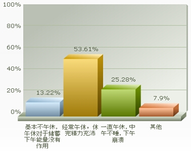 提升睡眠质量,对抗疲倦,振奋精神状态,同学们也有各自不同的解决之道。在白天课程压力较大的情况下,中午的小憩成为许多同学最为重要的“加油站”。在调查中关于午睡情况的问题“您觉得午休对于您的意义有多大?”(图7),只有13.22%的同学选择了“基本不午休,午休对于储蓄下午能量没有作用”,而近53.61%的同学则选择“经常午休,休完精力充沛”,甚至有25.28%的同学表示“一直午休,中午不睡,下午崩溃”。由此可见,午休时间对于学生群体一天精神状态的保障,具有举足轻重的意义。