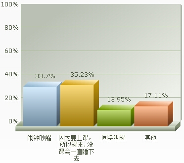 “晚睡”是事实,“早起”也“无奈”,那“晚睡早起”的大学生们,你们睡眠的时间够吗?对“从主观来判断,您觉得您的睡眠时间充足吗?”这一问题的反馈结果来看(图3),有近半数的同学认为自己的睡眠时间长度“一般”,认为睡眠“不充足”的同学也不在少数,占了总数的18.22%。当被问到每天早上如何醒来的时候,46%的同学选择了“闹钟或同学叫醒”,而35.23%的同学则表示“因为要上课,所以醒来,没课会一直睡下去(如图4)”。因此,也能从一定程度上反映出同学们“睡不够”和“睡不醒”的情况,而这些都意味着睡眠质量不高,对人体健康会带来影响。
