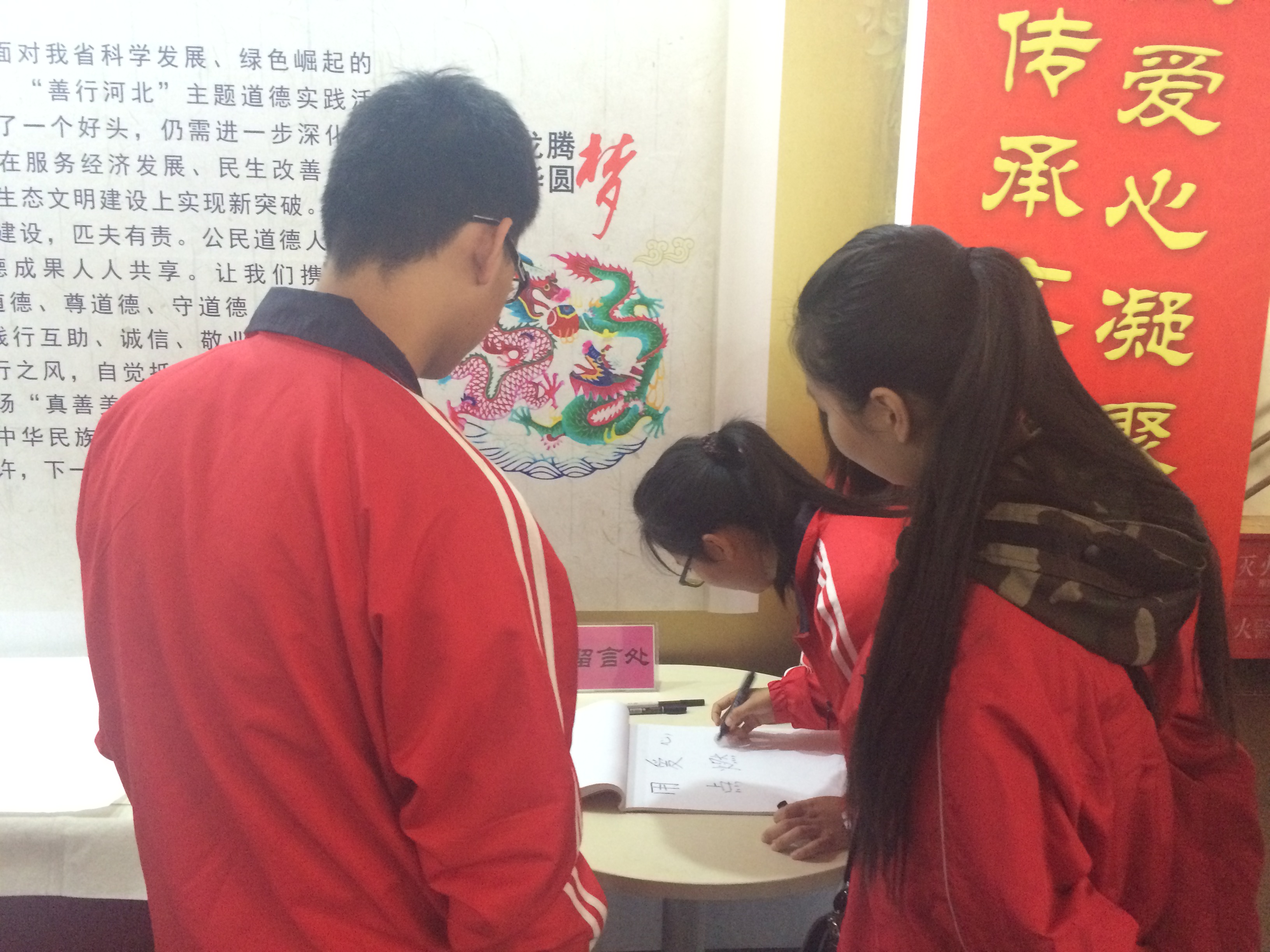 同学们认真看着每一张图片,详细听着讲解员的讲解,本次展出的典型人物事迹在同学们中间引起了热烈反响,他们纷纷表示本次展出的各类先进典型可亲、可敬、可学,为当代大学生树立了道德新标杆,引领着社会好风尚,激发了人们向上向善的精神力量。刘寒同学说:“助人为乐的高淑珍、诚信经营的油条哥、爱岗敬业的贾永青、割肝救父的张建霞、乐行节俭的马永禄……在他们的身上,我们看到了团结互助、无私奉献的精神,汇聚起强大的正能量,激励燕赵儿女为早日实现中华民族伟大复兴的‘中国梦’而努力奋斗。”