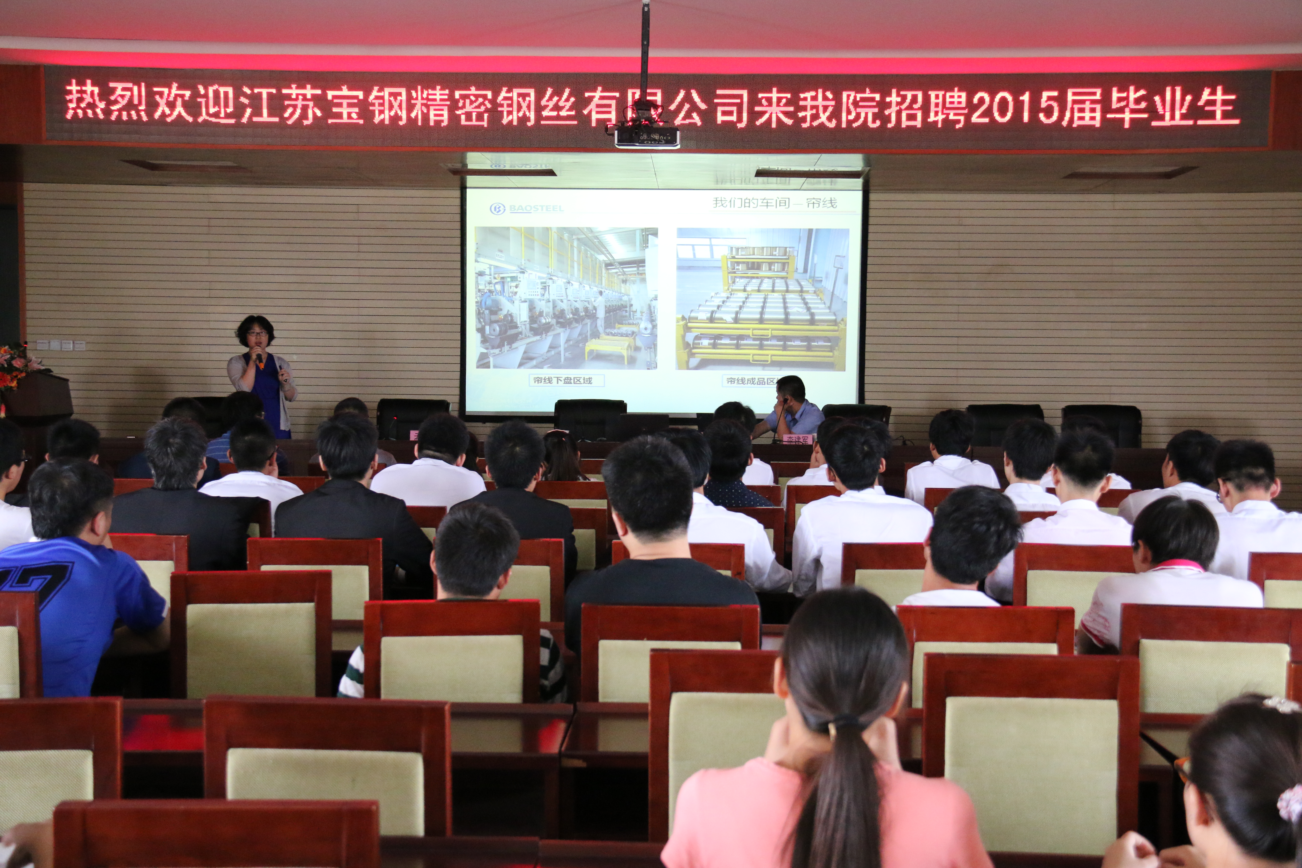 近日,江苏宝钢精密钢丝有限公司副书记兼综合部周婕部长一行三人来我院招聘2015届毕业生,该公司是首次与我院合作,是我院今年新开发知名企业之一,招聘专业涉及冶金材料类、电气类、机械类等工科类专业,经过宣讲、初选、面试,最终有21名毕业生被录用,这部分被录用的学生将利用暑期从7月14日—26日在我院进行为期两周的上岗培训,培训结束直接到单位进行顶岗实习,同时对培训后合格的学生,公司将为每位学生提供第三年学费(5000元/人)。