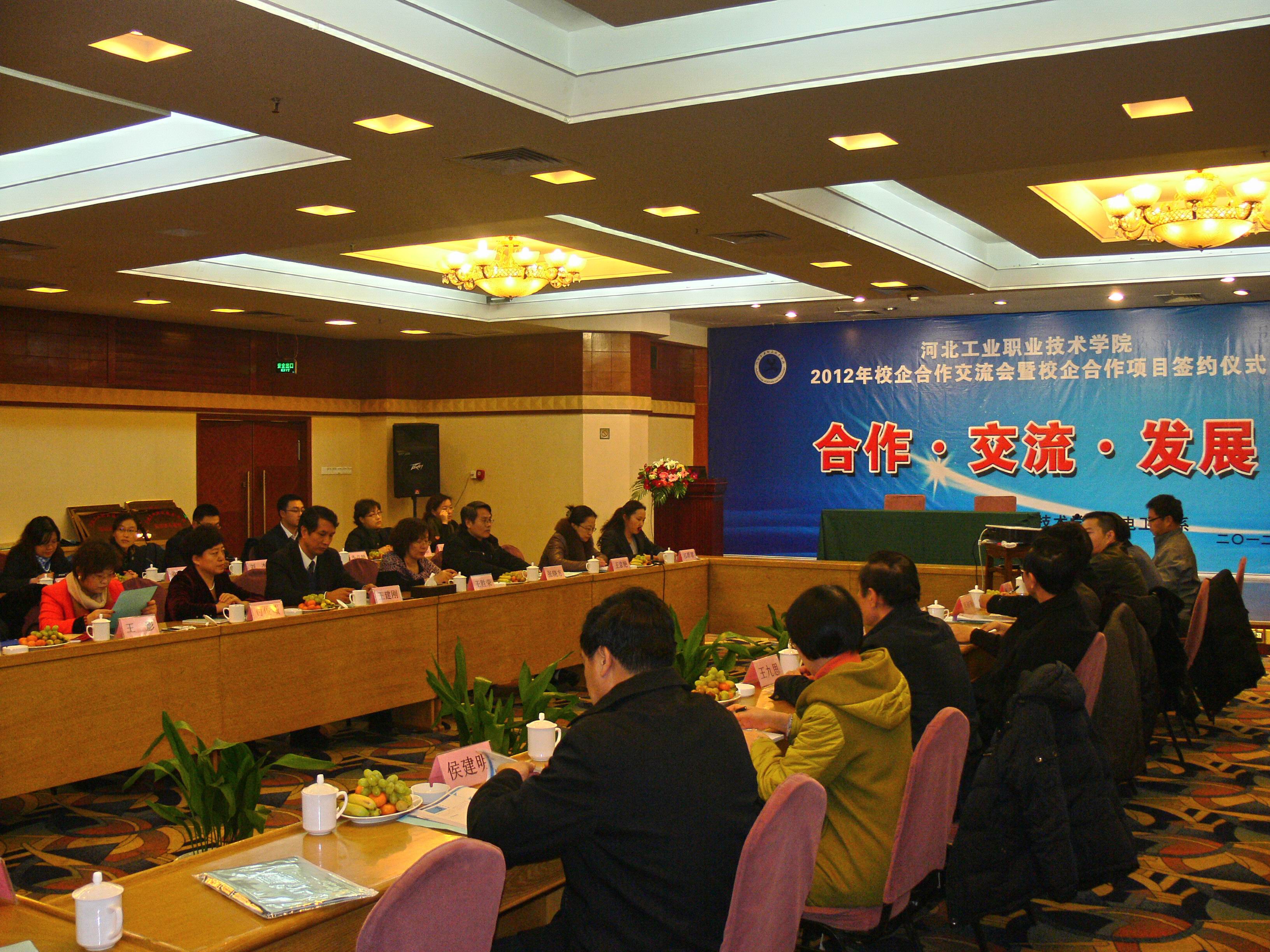 12月15日,我院机电工程系“2012年度校企合作交流会暨校企合作项目签约仪式”隆重召开。会议特邀河北省人民政府国有资产监督管理委员会政策法规处杨佺副处长、石家庄市发展和改革委员会服务办市场处王九思处长、河北省机械行业协会信息部王京艳主任、中国人民解放军第三三零二工厂党委邓萍书记、中国电子科技集团第十三研究所副总工程师何庆国先生、中国兵器工业集团凌云集团河北太行成型设备有限公司何树忠董事长、长城汽车股份有限公司技术研发部鲁立强部长、石家庄纺织机械有限公司侯建明副总经理、石家庄金刚内燃机零部件集团有限公司人力资源总监韩杰先生、南车集团石家庄车辆有限公司王宏斌副总经理等近30位来自政府、行业、企业各界的代表参加会议。学院王建刚副书记、付俊薇副院长、王世龙副院长出席会议,教务处、就业指导中心负责人参加了会议。