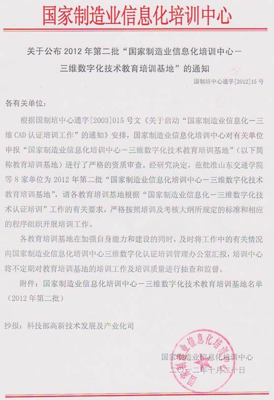 近日,我院被国家科技部国家制造业信息化培训中心批准为“三维数字化技术教育培训基地”。