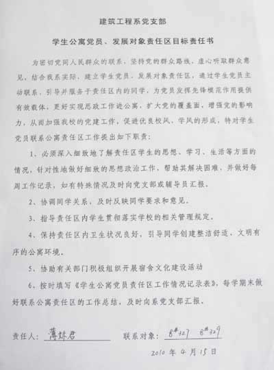 系党支部在原有的责任区规章制度的基础上,进一步细化了责任区分配,完善了责任区管理制度与考核细则,在《学生党员、发展对象责任区目标责任书》中,对学生党员、发展对象联系责任区工作提出了一系列要求,如:必须深入细致地了解责任区学生的思想、学习、生活等方面的情况,针对性地做好思想政治工作,帮助其解决困难;保持责任区内卫生状况良好,引导同学创建整洁舒适、文明有序的公寓文化环境等。这一活动得到了党员、发展对象们的普遍支持。活动期间,每位成员都投入了极大的热情,积极主动的与责任区的同学进行沟通交流。党员走进责任区,不仅拉近了党员与责任区内同学们之间的距离,加强了对责任区情况的了解,同时也宣传了我院示范建设和迎评工作,树立了党员在同学们心中的形象。