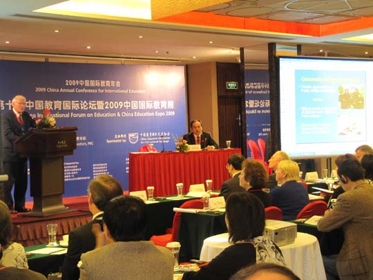 2009年10月16日,由中国教育国际交流协会主办的第十届中国国际教育年会暨2009中国国际教育展在北京开幕。董兆伟院长应邀参加了此次年会。本届年会的主题是“教育改变世界”。年会上,共举办了5个专题论坛,即:“职业教育国际研讨会”、“中美大学校长论坛”、“基础教育国际研讨会”、“继续教育国际研讨会”、“国际学生流动论坛”。