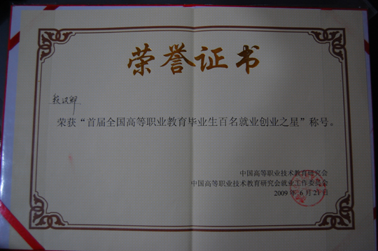 在中国高等职业教育研究会就业工作委员会联合百所高职院校、数十家新闻媒体举办的“首届高等职业教育毕业生百名就业创业之星”评选活动中,我院创业典型段汉卿同学获得“首届全国高职院校百名创业与就业之星”荣誉称号。