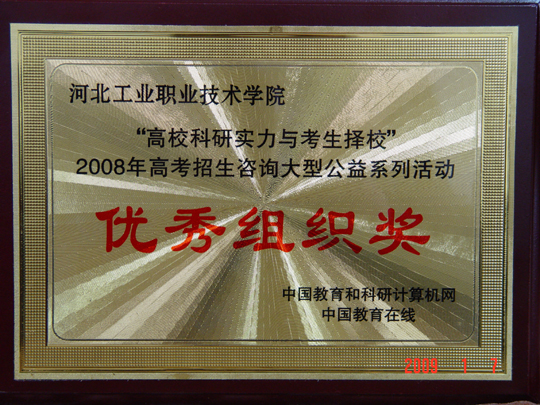 在中国教育和科研计算机网、中国教育在线组织的高考招生网络咨询活动中,我院获“高校科研实力与考生择校”2008年高考招生咨询大型公益系列活动优秀组织奖。