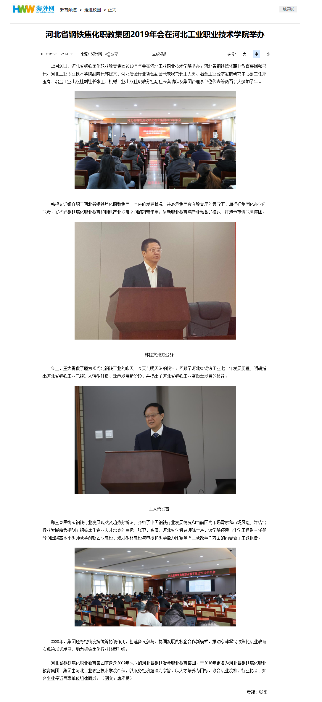 海外网(《人民日报》海外版官网)报道河北省钢铁焦化职教集团2019年年会在我院举办