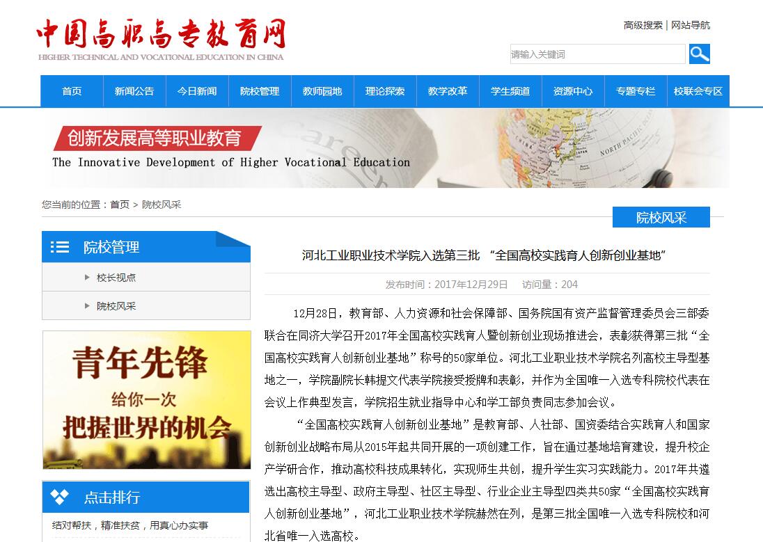 中国高职高专网报道我院入选第三批 “全国高校实践育人创新创业基地”