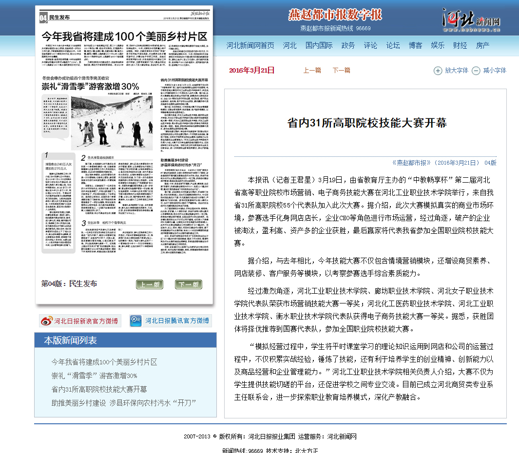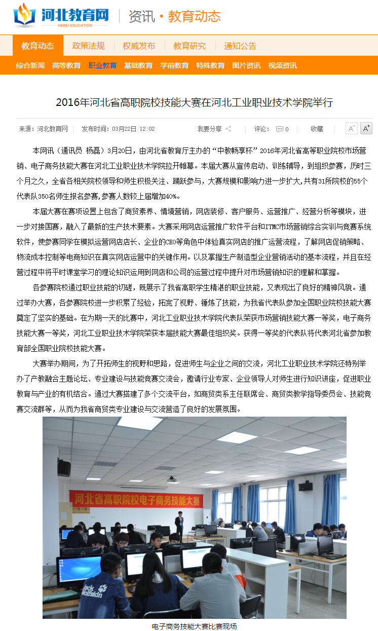 3月20日,由河北省教育厅主办的“中教畅享杯”第二届河北省高等职业院校市场营销、电子商务技能大赛在我院拉开帷幕。河北新闻网、燕赵都市报、河北教育网、今日头条对此项赛事进行了报道。