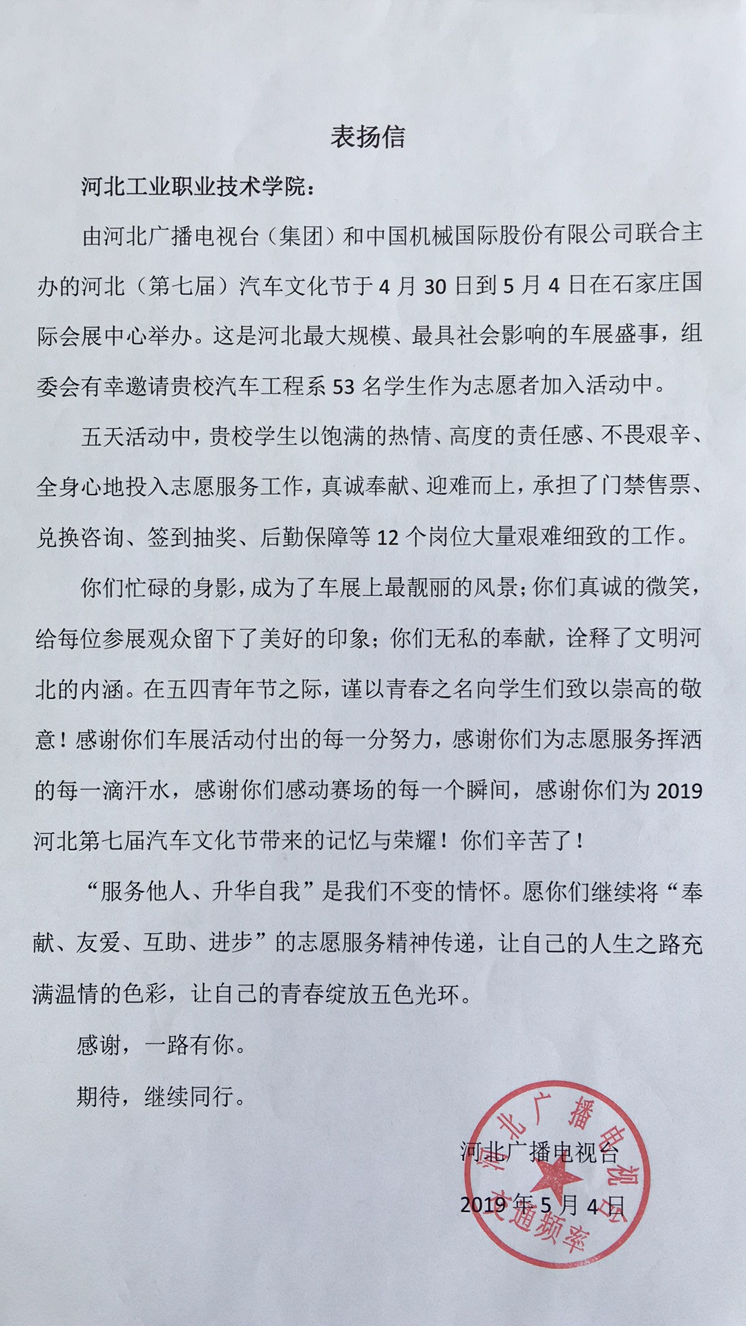 河北第七届汽车文化节是河北最大规模、最具社会影响的车展盛事。五天活动中,我院学生们用饱满的热情、高度的责任感、不畏艰辛、全身心地投入志愿服务工作,真诚奉献、迎难而上,承担了门禁售票、兑换咨询、签到抽奖、后勤保障等12个岗位大量艰难细致的工作。志愿者们忙碌的身影成为车展上最靓丽的风景线,无私的奉献,诠释了文明河北的内涵。活动结束后,我院学生收到了来自河北广播电台送来的表扬信。