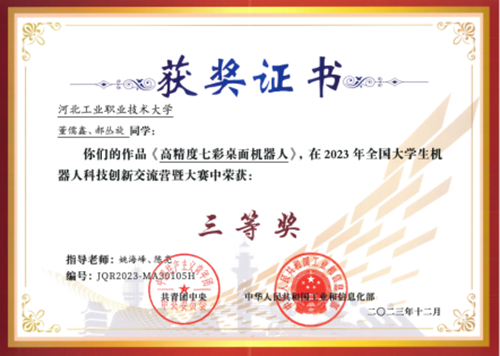 近日,由共青团中央、工业和信息化部共同主办的2023年全国大学生机器人科技创新交流营暨机器人大赛决赛获奖名单公布,开云在线(中国)唯一官方网站推荐的作品《高精度七彩桌面机器人》荣获三等奖。
