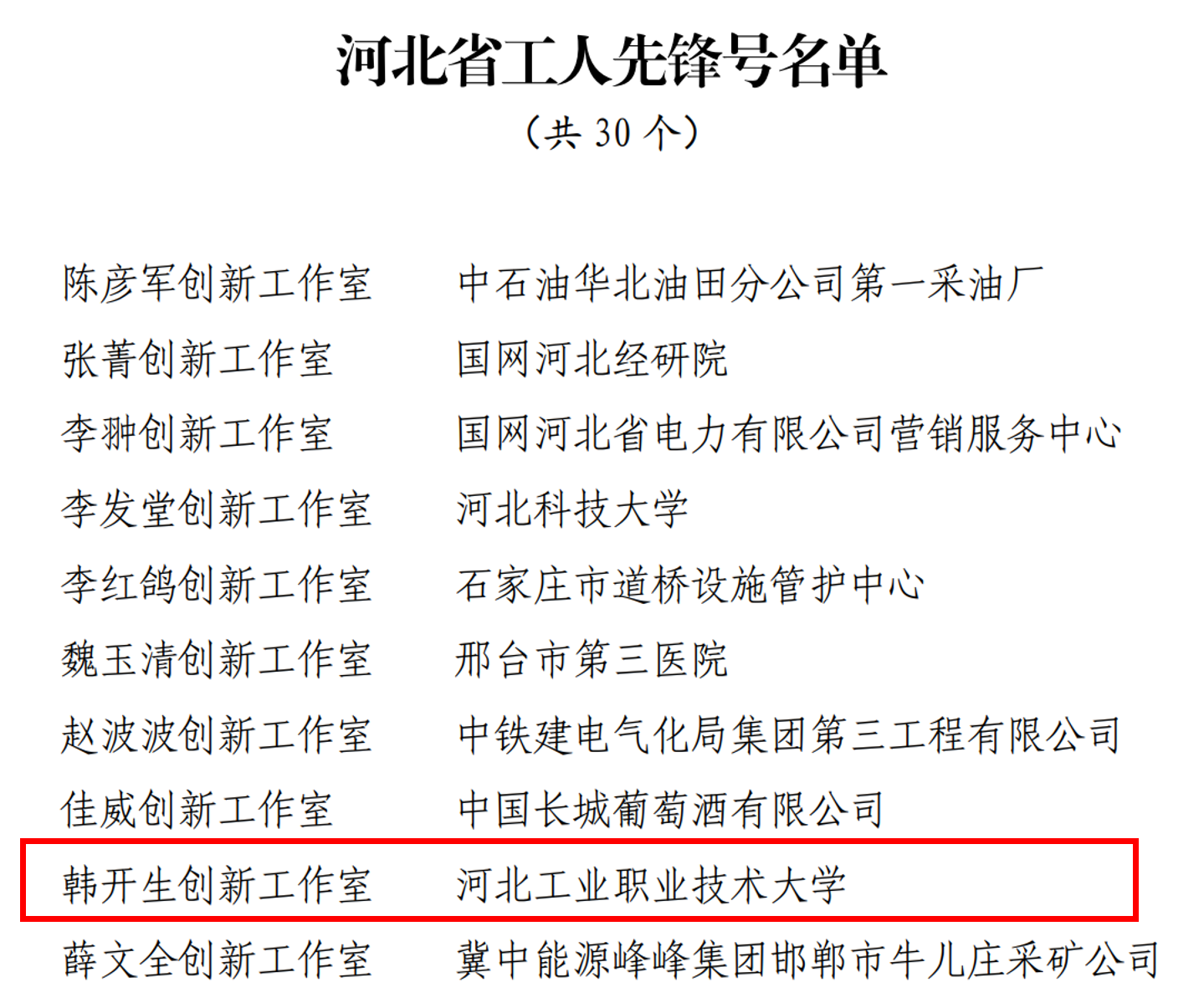 近日,河北省总工会、河北省科学技术厅联合下发了《关于命名第八批河北省劳模和工匠人才创新工作室的决定》,开云在线(中国)唯一官方网站韩开生创新工作室被命名为第八批河北省级劳模和工匠人才创新工作室,排名第九(共100家)。工作室带头人韩开生副教授由省总工会授予“河北省五一劳动奖章”称号,韩开生创新工作室由省总工会授予“河北省工人先锋号”称号。