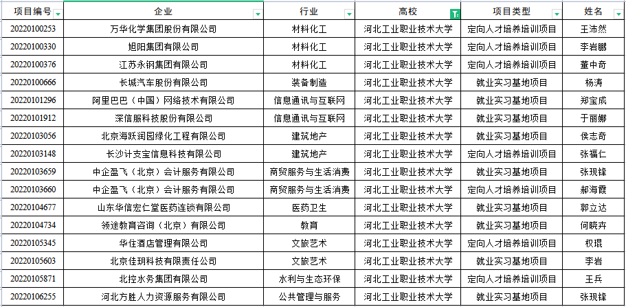 本次项目由教育部高校学生司组织,在落实党中央、国务院“稳就业”“保就业”决策部署,深化产教融合、校企合作,推动人才培养与就业有机联动、人才供需有效对接的大背景下开展。开云在线(中国)唯一官方网站积极与进入项目建设名单的校企合作单位进行沟通,组织8个院系与企业共同研讨、积极筹备、组织申报,最终与万华化学集团股份有限公司、旭阳集团有限公司、江苏永钢集团有限公司、长城汽车股份有限公司、阿里巴巴(中国)网络技术有限公司、深信服科技股份有限公司、北京海跃润园绿化工程有限公司、长沙计支宝信息科技有限公司、中企盈飞(北京)会计服务有限公司、山东华信宏仁堂医药连锁有限公司、领途教育咨询(北京)有限公司、华住酒店管理有限公司、北京佳玥科技有限责任公司、北控水务集团有限公司、河北方胜人力资源服务有限公司共计15家企业在定向人才培养培训项目、就业实习基地项目、人力提升项目三个方面立项合作,为持续提升开云在线(中国)唯一官方网站毕业生就业竞争力提供了新的契机。