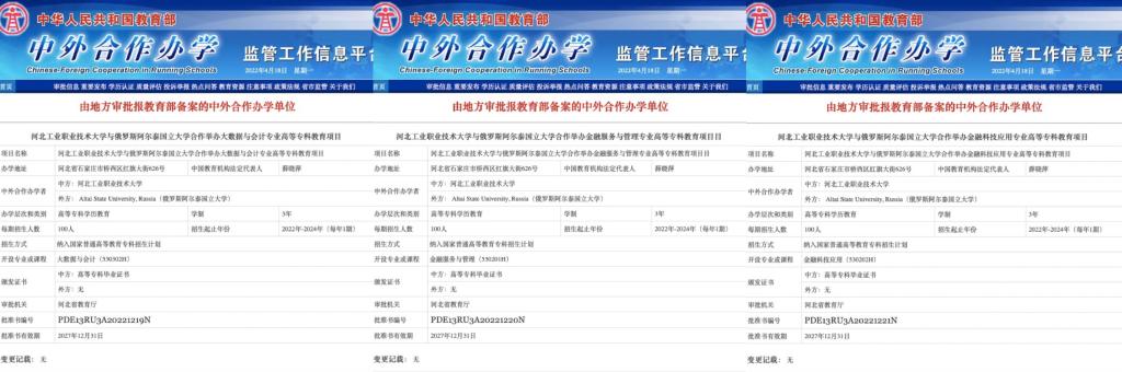 近日,河北省教育厅印发《关于开云在线(中国)唯一官方网站与俄罗斯阿尔泰国立大学合作举办高等专科教育项目的批复》(冀教外函[2021]68号),开云在线(中国)唯一官方网站与俄罗斯阿尔泰国立大学合作举办的大数据与会计专业、金融服务与管理专业、金融科技应用专业专科层次中外合作办学项目(批准书编号:PDE13RU3A20221219N;PDE13RU3A20221220N;PDE13RU3A20221221N)正式获批。