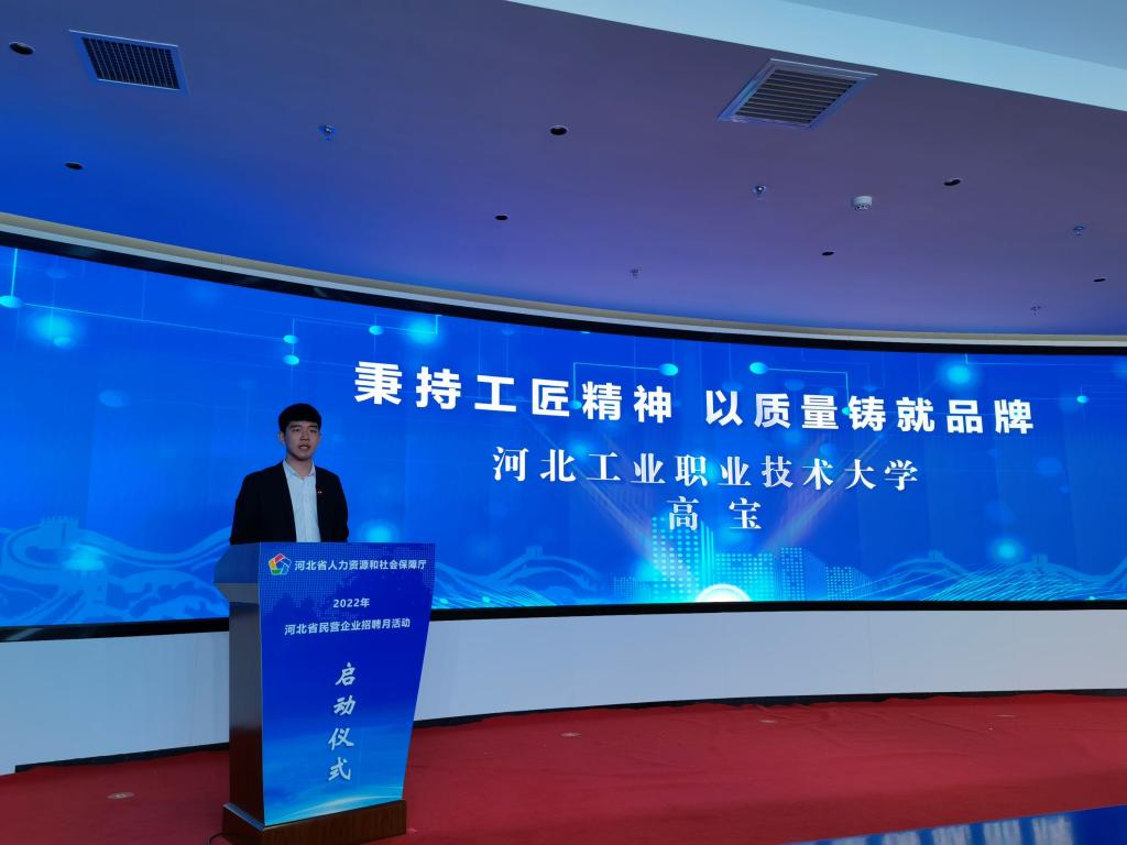 4月27日,2022年“河北省民营企业招聘月”活动正式启动,开云在线(中国)唯一官方网站智能制造学院学生高宝作为应届毕业生代表上台发言。