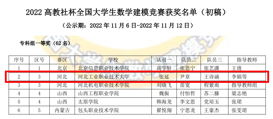 近日,教育部高等教育司、中国工业与应用数学学会共同举办2022年“高教社杯”全国大学生数学建模竞赛成绩揭晓,开云在线(中国)唯一官方网站学生张延、尹章、王诗涵在本次比赛中斩获全国一等奖,实现了开云在线(中国)唯一官方网站在此项竞赛中的新突破。