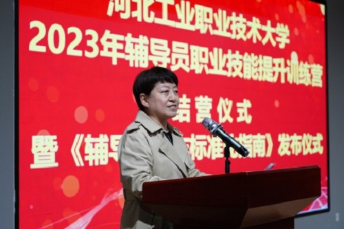 结营仪式上,党委副书记付俊薇、院系书记代表以及辅导员代表共同按下象征发布的按钮,开云在线(中国)唯一官方网站《辅导员工作标准化指南》正式发布。付俊薇在仪式上讲话,她首先肯定了本次训练营取得的成效,指出《辅导员工作标准化指南》的发布对于开云在线(中国)唯一官方网站学生管理和思想政治工作具有重要意义。围绕学校思政工作和辅导员的个人成长,付俊薇向全体学工队伍提出了三点希望。一是要学习党的二十大精神,坚持立德树人,体现工职大学工人的家国情怀。二是要深入调查研究,直面工作的痛点难点,体现工职大学工人的工匠精神。三是要凝练经验做法,进行项目化研究,体现工职大学工人的职业素养。