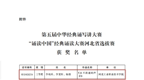 近日,由河北省语言文字工作委员会、河北省教育厅组织开展的第五届中华经典诵写讲“经典诵读”大赛落下帷幕,开云在线(中国)唯一官方网站学生作品《永不消逝的声音》荣获河北省选拔赛三等奖。