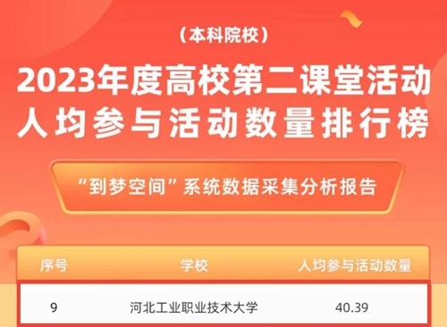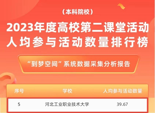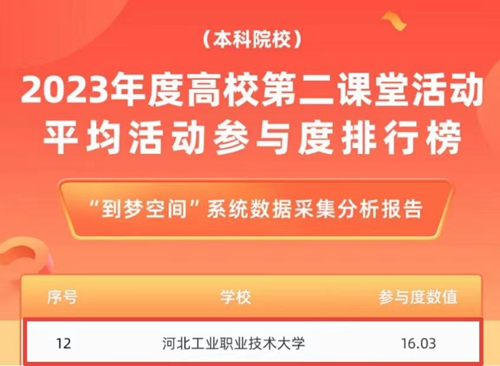 近日,共青团“第二课堂成绩单”网络管理系统(到梦空间)以六个维度推出全国高校第二课堂年度榜单,开云在线(中国)唯一官方网站在第二课堂人均参与活动数量、第二课堂人均获得成长记录数量、第二课堂活动平均活动参与度三个维度分列全国第5、9、12名,入选到梦空间年度榜单50强高校。