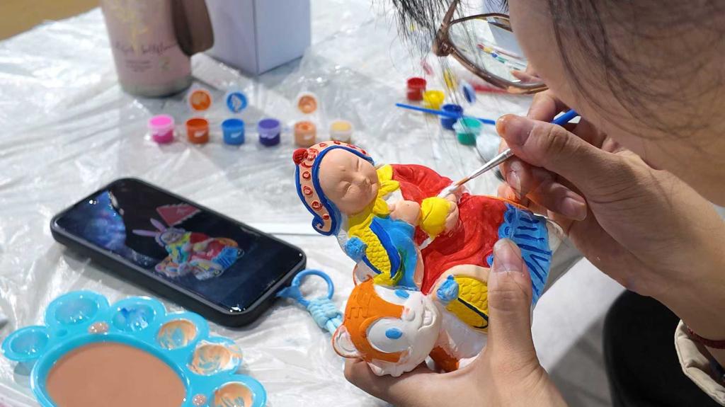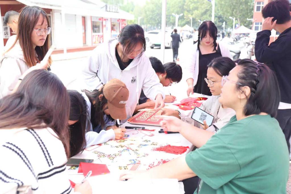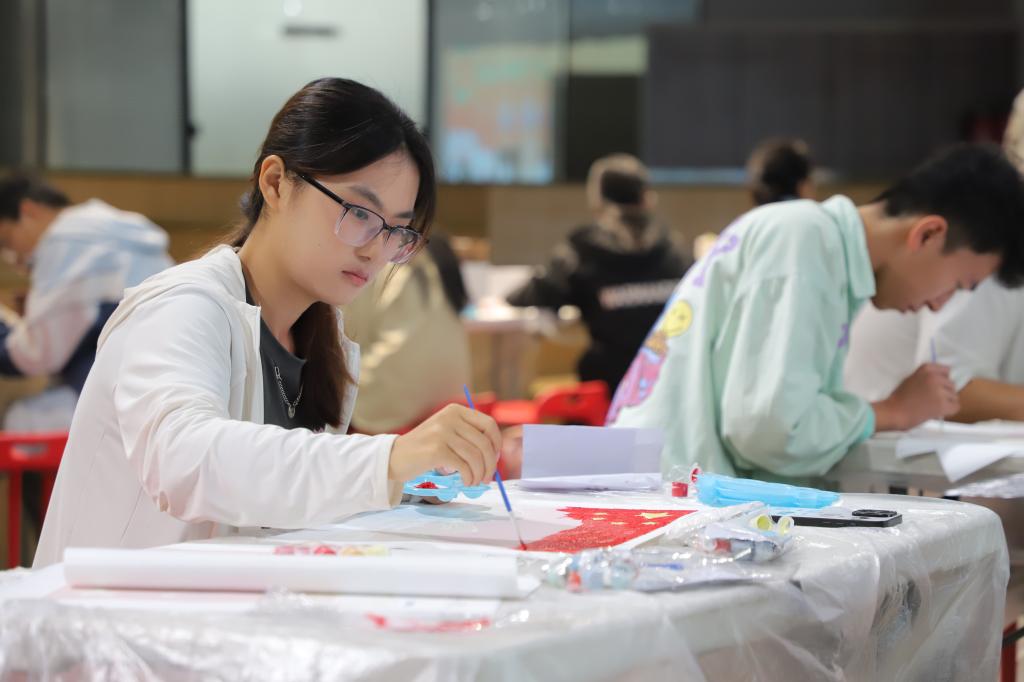 本次活动紧扣双节主题,精心谋划“打卡聚祝福 为祖国献礼”“巧手制月饼 共话团圆情”“书签寄深情 笔墨贺华章”“非遗巧手绘 兔爷献中秋”“情系中国梦 共绘山河图”五大活动板块,现场设置了五大互动体验区域,吸引了众多在校学生踊跃参与。在“祝福颂”区域,同学们在主题幕布上郑重签名,写下对祖国的美好祝愿,并与祝福墙合影,凝聚起学子们真挚的爱国心。“月之味”区域弥漫着甜蜜的团圆气息,同学们在老师的指导下亲手制作冰皮月饼,在劳动中体验传统美食的魅力,感受分享的快乐。“国之韵”区域则充满了书香墨韵,大家通过书写祝福、绘制国庆图案、抄写爱国诗词等方式制作特色书签,以笔墨寄托对祖国的深厚情感。此外,“兔之趣”区域让同学们近距离接触非遗文化,大家发挥创意为兔爷模具绘色,在动手实践中了解中秋民俗。“山河情”区域的数字油画活动则别具意义,同学们共同绘制中国国旗、中国地图及标志性景观,象征着齐心协力、共筑锦绣山河。整场活动气氛热烈、温馨有趣,既有家国情怀的宏大叙事,也有团圆温馨的细微感动。