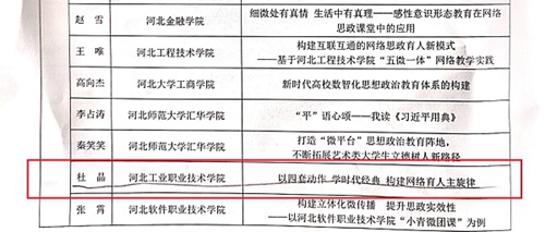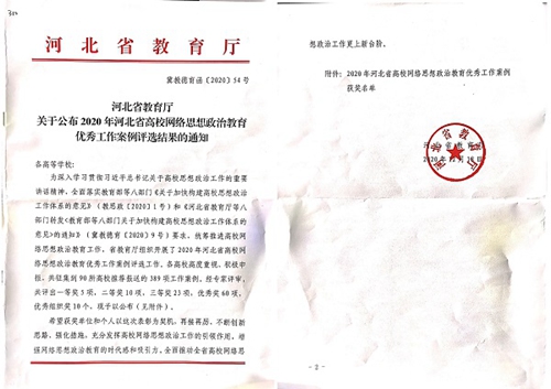 日前,河北省教育厅公布了2020年河北省高校网络思想政治教育优秀工作案例评选结果,开云在线(中国)唯一官方网站杜晶老师申报的《以四套动作,学时代经典,构建网络育人主旋律》荣获2020年河北省高校网络思想政治教育优秀工作案例三等奖。本次活动由河北高校网络思想政治中心组织,以“构建网络育人新格局,唱响网上时代主旋律”为主题,旨在深入梳理分析新时代思想政治工作面临的新形势、新任务、新要求,切实推动网络思想政治教育模式创新,增强网络思想政治教育的时代感和吸引力。