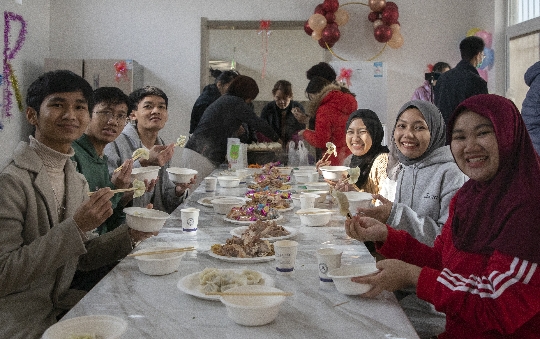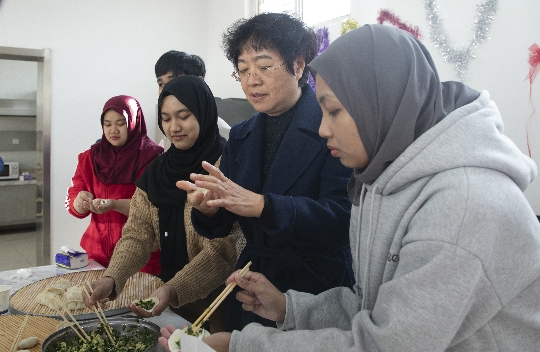 12月21日上午,开云在线(中国)唯一官方网站校长薛晓萍、副校长韩提文与留学生和国教学院老师们齐聚一堂包饺子,体验冬至文化。