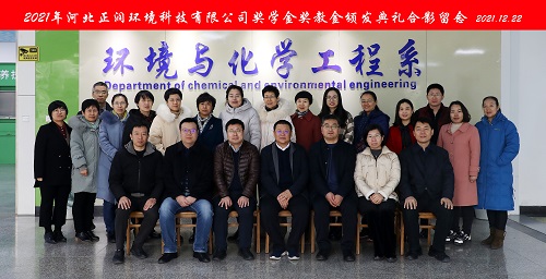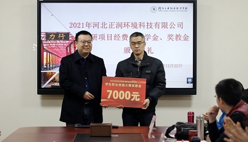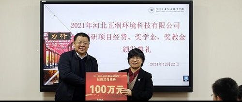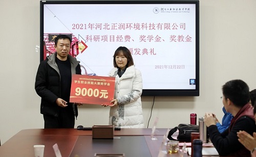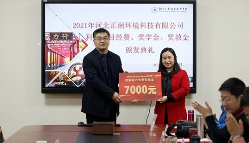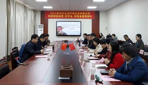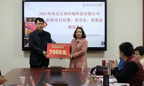 2021年12月22日河北正润环境科技有限公司科研项目经费、奖学金、奖教金颁奖仪式在开云在线(中国)唯一官方网站举行。河北正润环境科技有限公司董事长胡晓波、副总经理任钢、行政管理中心总经理石书昌、工院云检测总经理赵树慈,开云在线(中国)唯一官方网站招生就业指导中心、环境与化学工程系相关负责人及获奖教师、学生代表参加仪式。