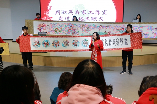 蔚县剪纸艺术是在方寸之间刻画形象生动、富有神韵的图案,周淑英老师首先结合自己的创作经历,以“蔚县剪纸艺术的欣赏与实践”为主题,向在场师生讲述了自己从接触剪纸、爱上剪纸到开创多种技法的学艺和实践经历,展现了一名非遗传承人“守正”与“创新”的精神品格。随后周老师拿出精心挑选的《祥龙送福-九龙图》《五牛神图》《美丽冬奥》《西柏坡五大书记》等代表作品,在师生共同欣赏匠心之作的同时,分别讲解了作品的创作理念、题材背景、剪纸技艺,展示并阐述了极具中华民族特色的吉祥元素、西柏坡红色革命精神、北京冬奥会的冰雪故事。交流中,周老师拿出一把剪刀、几页红纸,一双灵巧的手上下翻飞,纸屑纷纷落下……就这样,一只蝴蝶形状、配有平鸽与莲花图案、象征着世界和平的剪纸作品在周老师手中“诞生”。在现场师生热烈的掌声中讲座结束,学生工作部负责人为周淑英老师颁发了“美育大讲堂”主讲人聘书,为后续开展系列特色美育课程打开了一扇窗。