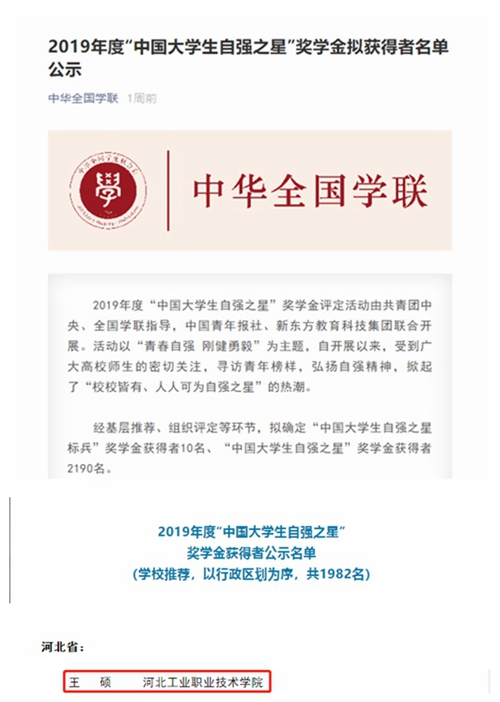 近日,由共青团中央、全国学联等部门联合开展的“中国大学生自强之星”奖学金评选结果揭晓。开云在线(中国)唯一官方网站智能制造系王硕同学经过层层推荐,荣获2019年度“中国大学生自强之星”。