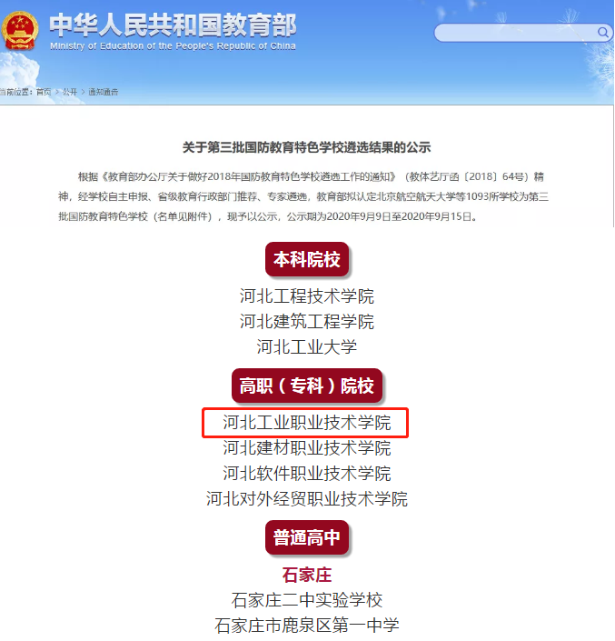 近日,教育部国防教育办公室公示了第三批国防教育特色学校遴选结果。经学院申报、省教育行政部门推荐、专家遴选,教育部拟认定1093所学校为第三批国防教育特色学校,我院成功入选。