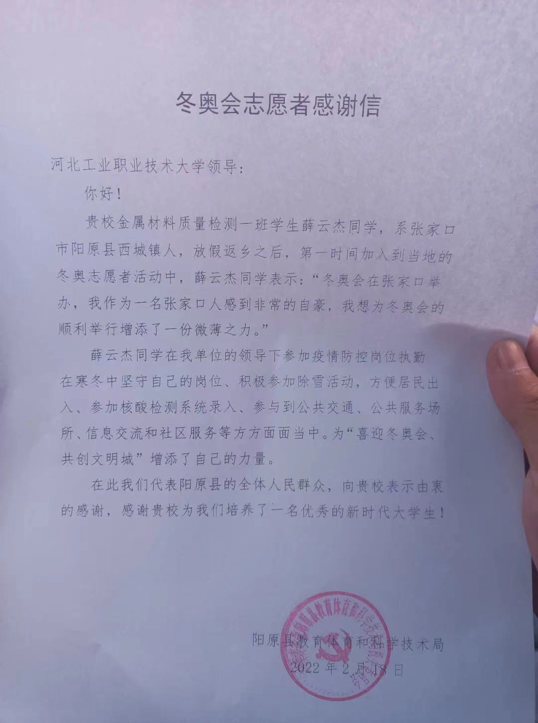“感谢贵校为我们培养了一名优秀的新时代大学生!”2月18日,正在参与冬奥志愿服务的薛云杰收到了这封来自阳原县的感谢信。