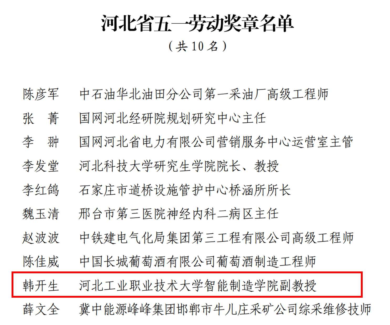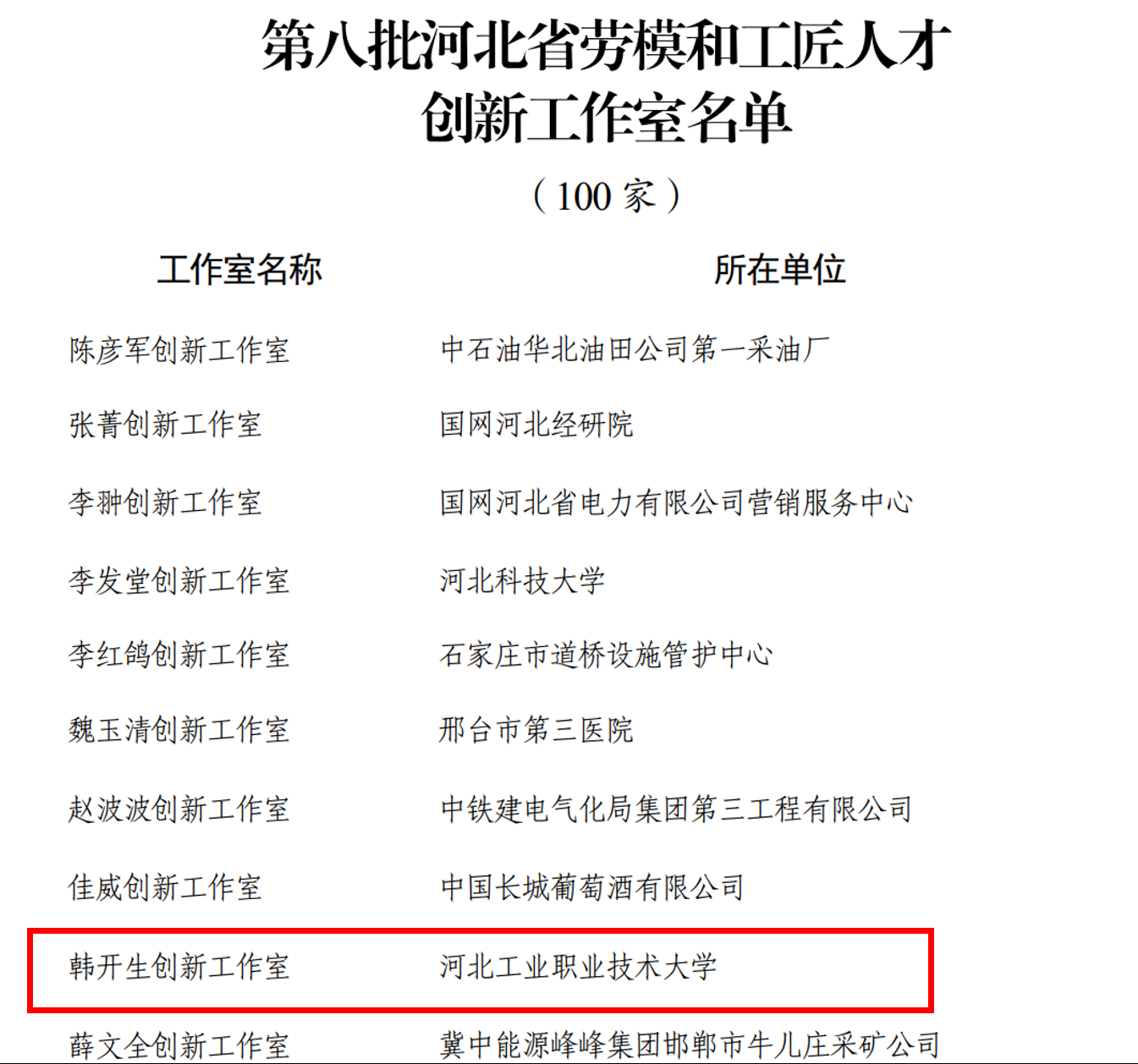 近日,河北省总工会、河北省科学技术厅联合下发了《关于命名第八批河北省劳模和工匠人才创新工作室的决定》,开云在线(中国)唯一官方网站韩开生创新工作室被命名为第八批河北省级劳模和工匠人才创新工作室,排名第九(共100家)。工作室带头人韩开生副教授由省总工会授予“河北省五一劳动奖章”称号,韩开生创新工作室由省总工会授予“河北省工人先锋号”称号。